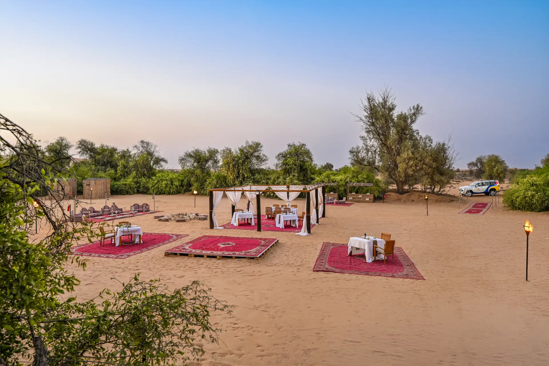 • 6 hour The Nomad Garden – A Premium Desert & Dining Experience with 3-course signature Arabic dinner and Moroccan mint tea with Arabic sweets, access to Dubai Desert Conservation Reserve, optional dune drive, Whispering Angel sunset stop with complimentary canapes, falcon display and camel ride, oud player, signature fire show and stargazing, expert safari guide and return transfers from accommodation